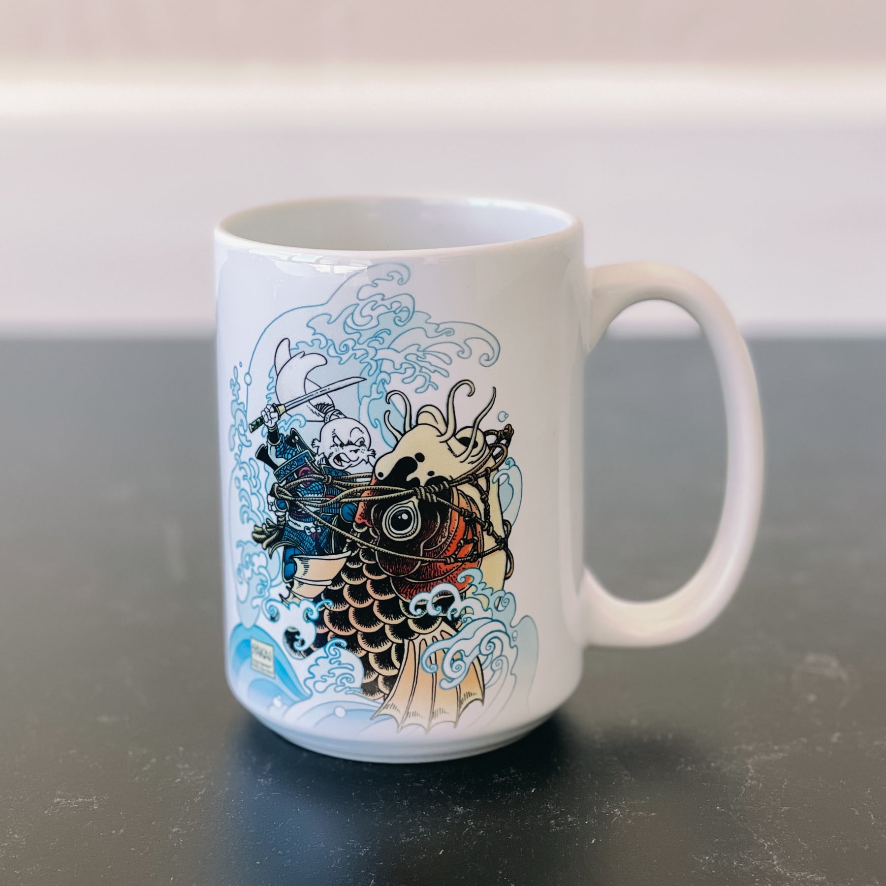 Our first Usagi Yojimbo coffee mugs are here! The beautiful design was created from Stan Sakai's Usagi Yojimbo IDW Issue #22 with the UY chop logo on the back. Each 15 oz. ceramic mug is individually sublimated in the USA by hand. Limited edition small batch