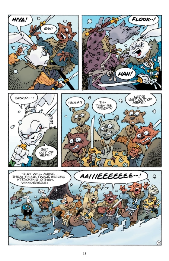 Usagi Yojimbo returns to Dark Horse with this graphic novel! Following the events of “The Green Dragon,” Usagi and Yukichi are still in the snowy mountaintops of Northern Japan. They are led to the hut of a strange woman hermit who allows them to spend the night. Meanwhile, the maniacal Jei and his familiar, Keiko, are on Usagi’s trail, and they stumble upon a bandit lair and subdue the band of cutthroats and thieves.